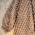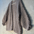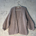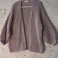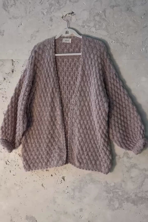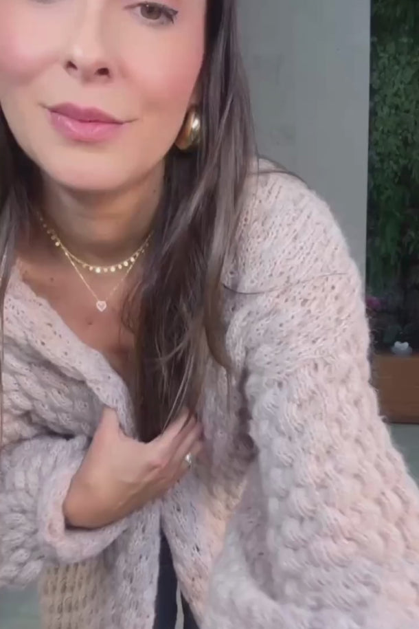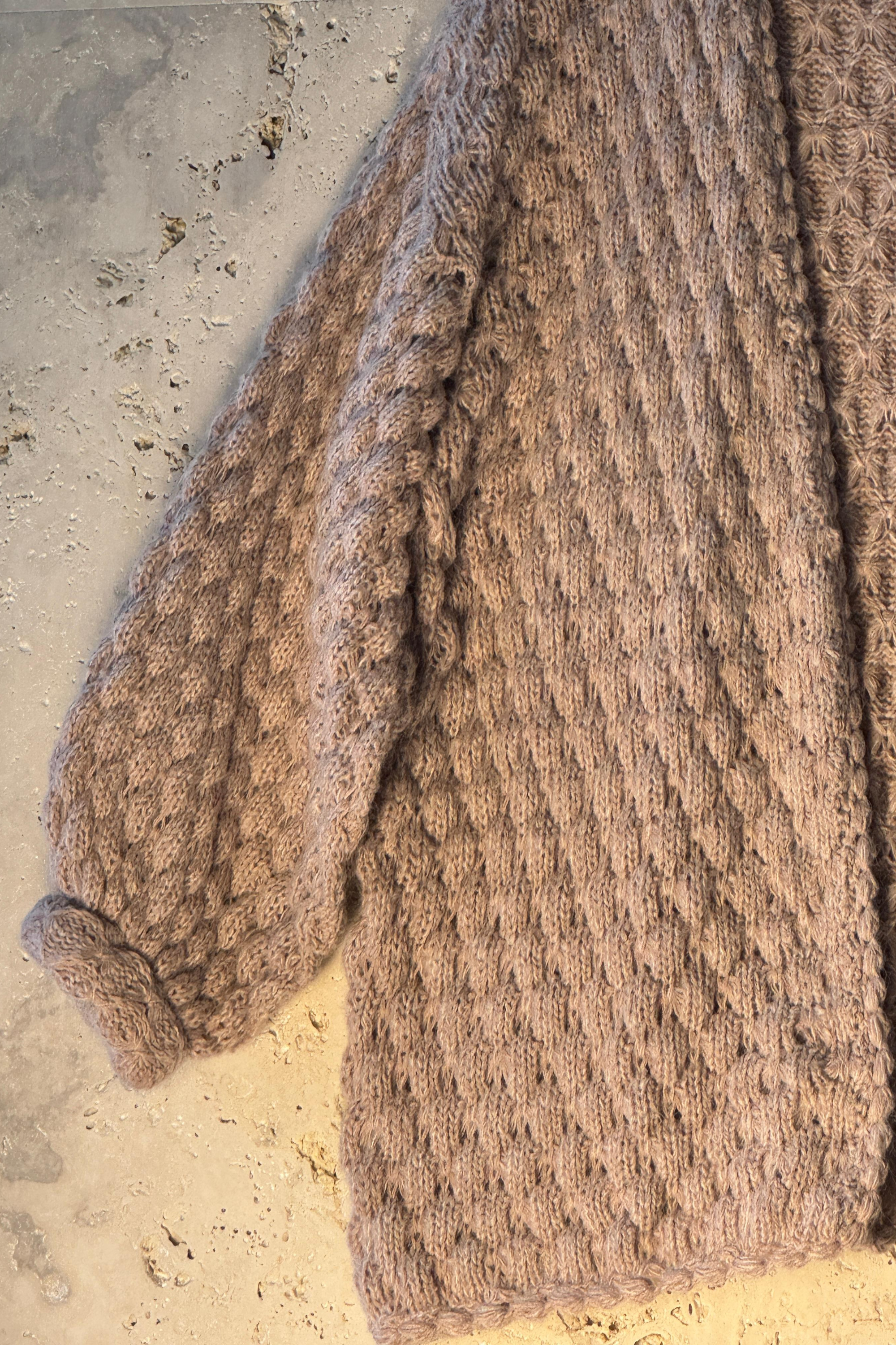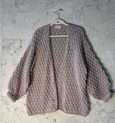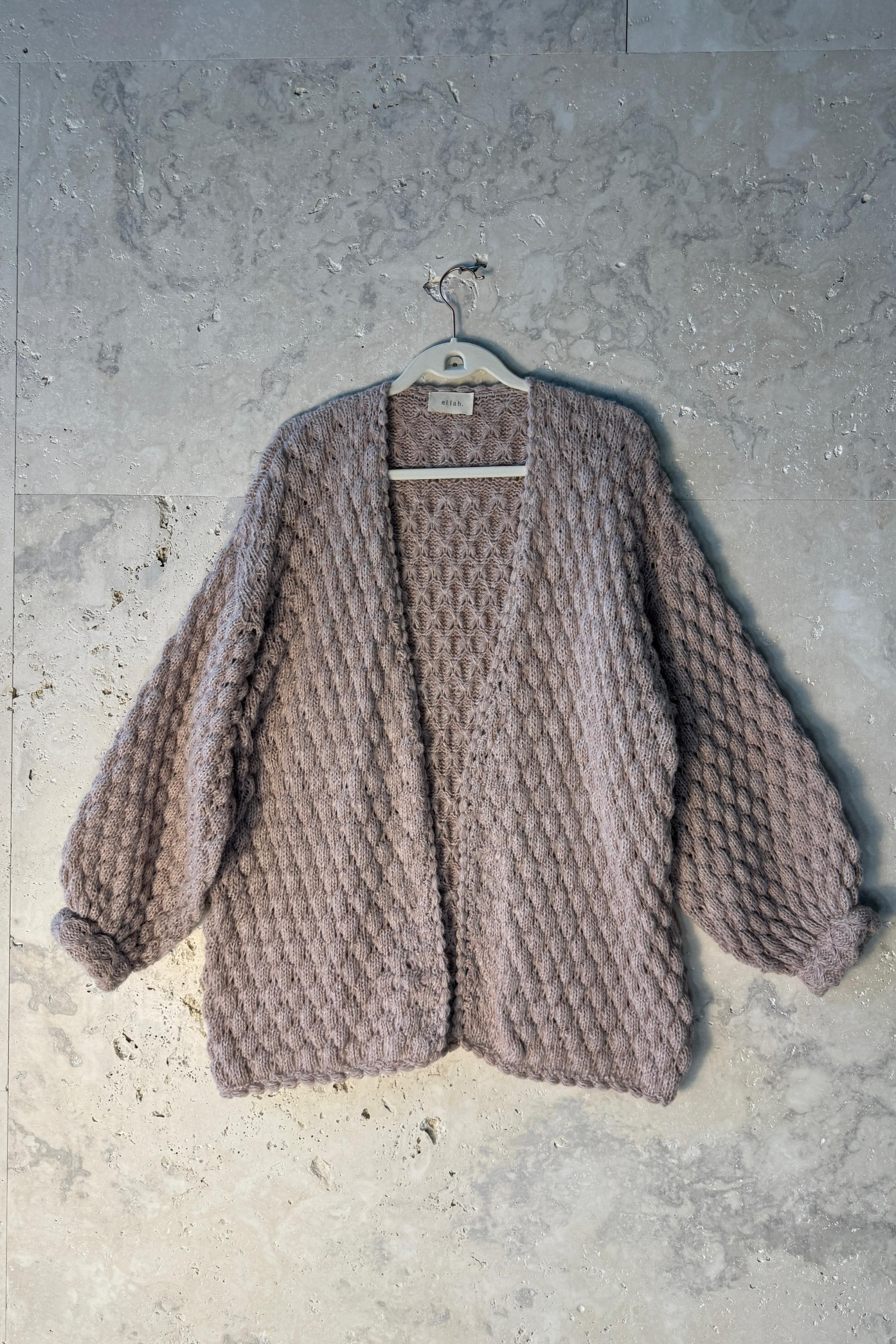 Casaco em tricô manual com ponto em relevo, confeccionado em fio rosé levemente felpudo, com mistura de viscose, algodão, acrílico e poliamida. Modelagem ampla, comprimento abaixo do quadril, mangas longas com volume e punhos ajustados. Decote em “V” aberto. Acabamento em toda a frente, barra e punhos em crochê manual com ponto ondulado.