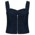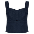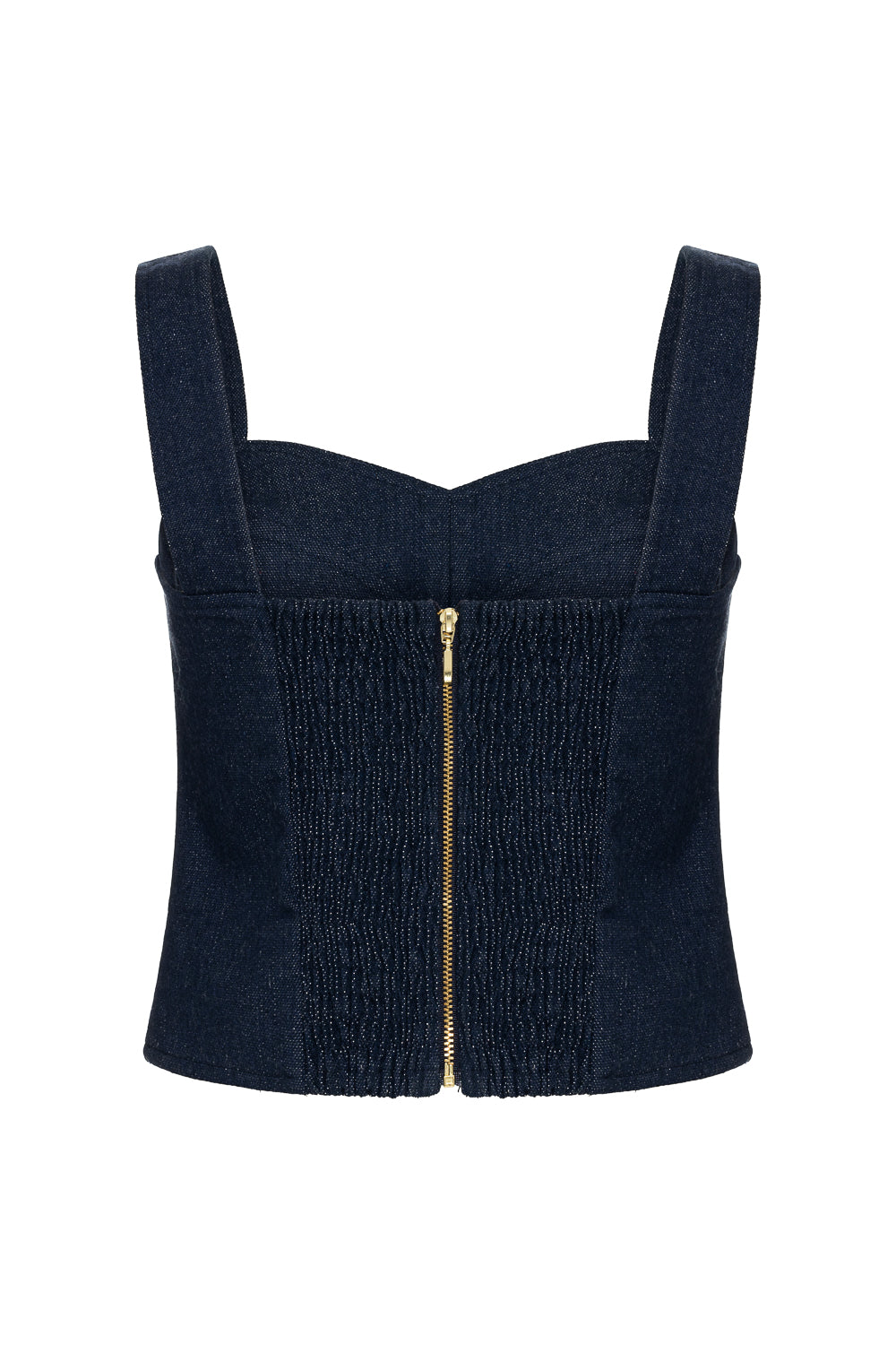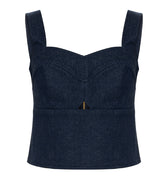 Regata em denim de algodão na cor azul marinho. Modelagem reta com decote princesa e alças largas. Possui recortes que valorizam o corpo. Costas com lastex para ajuste confortável e fechamento por zíper de metal.
