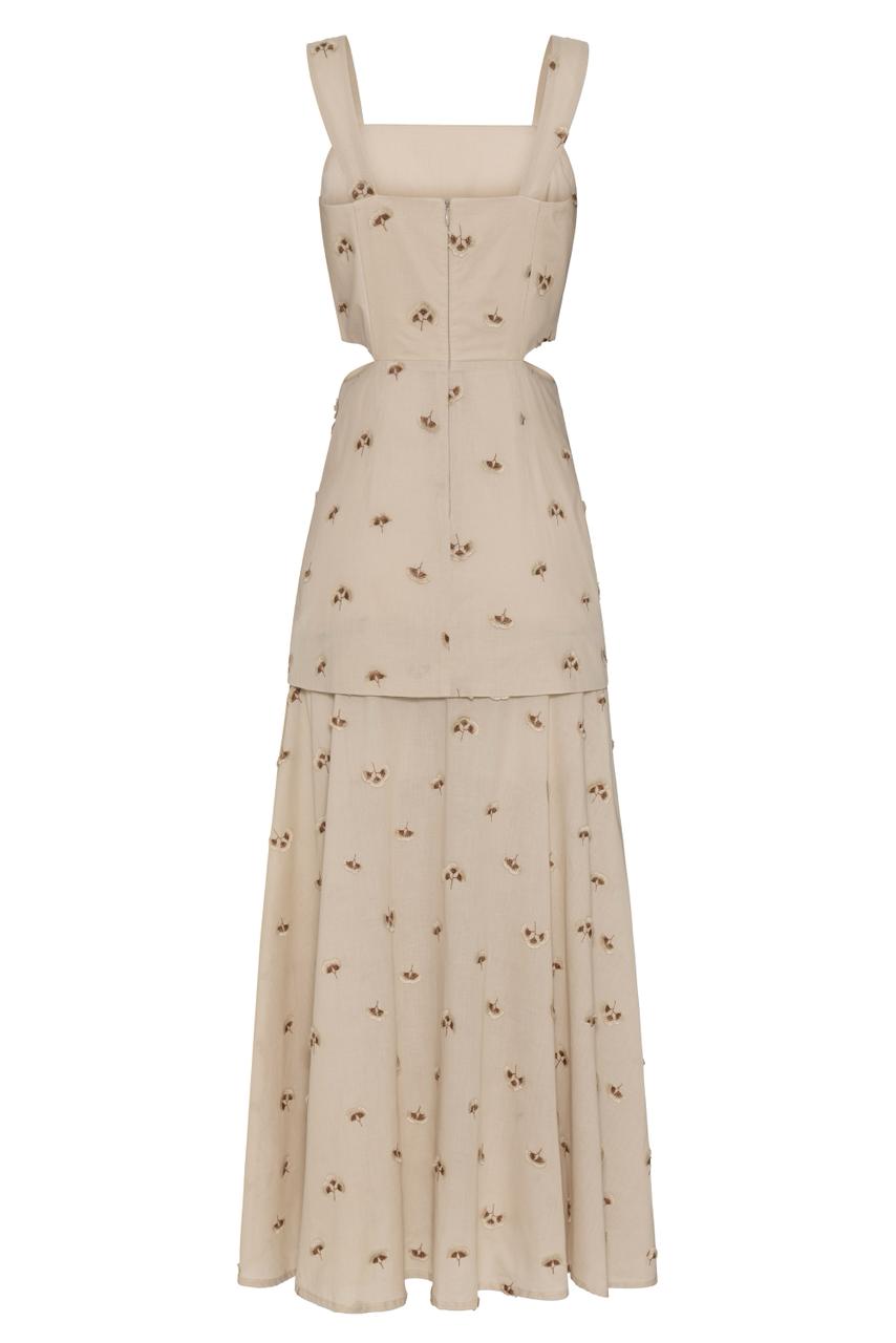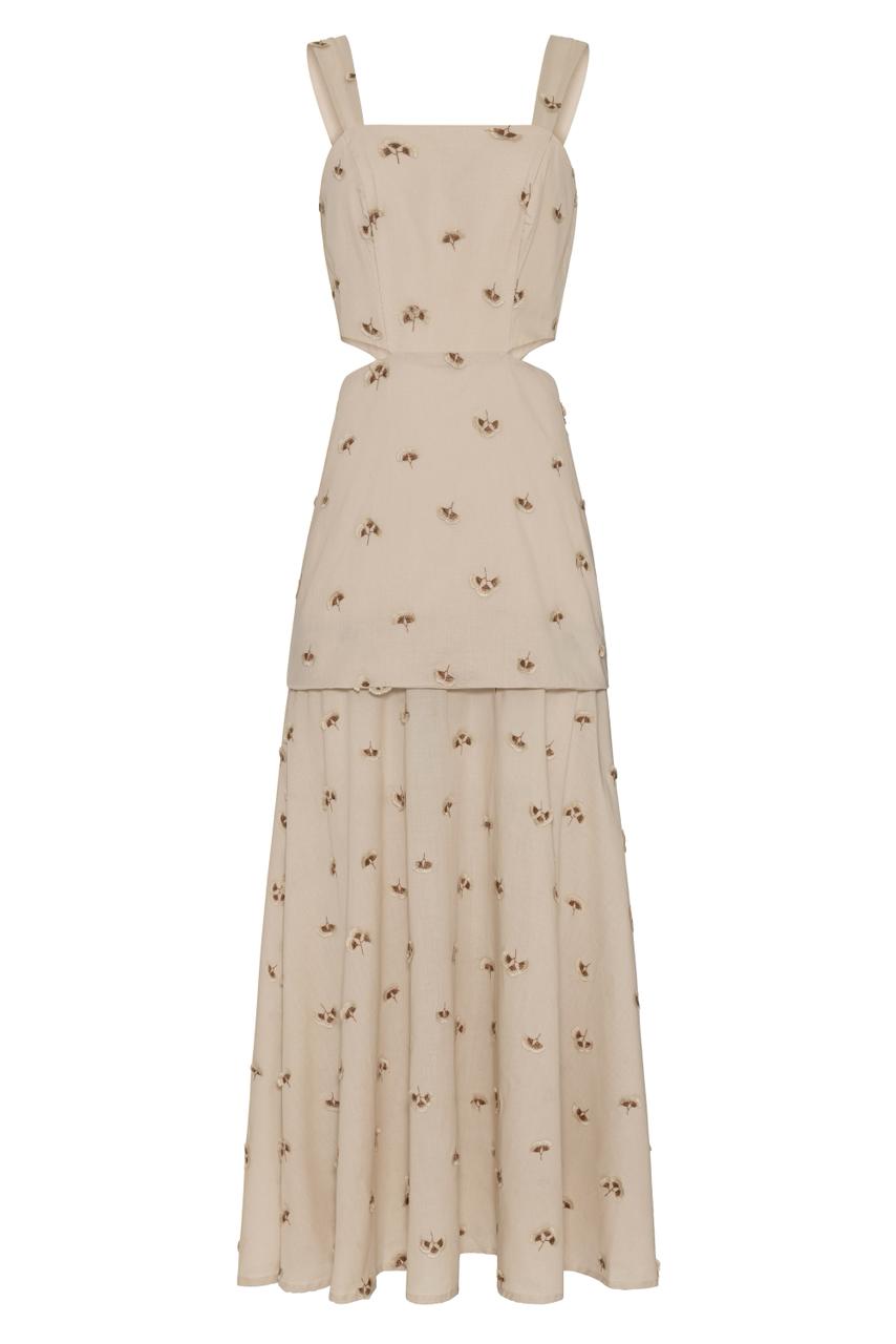 Vestido longo Aveia com aplicações de bordado por toda extensão com forro em viscose, decote reto com aberturas laterais na cintura, quadril com pala ajustada e saia com semi transparência longa, fechamento com zíper invisível