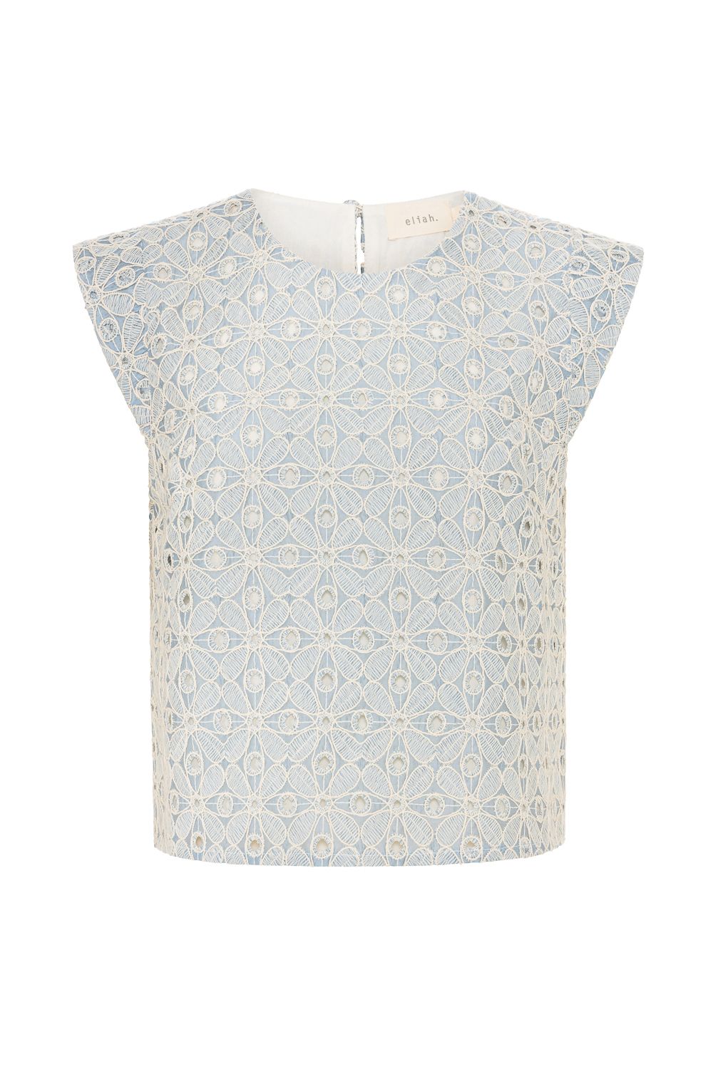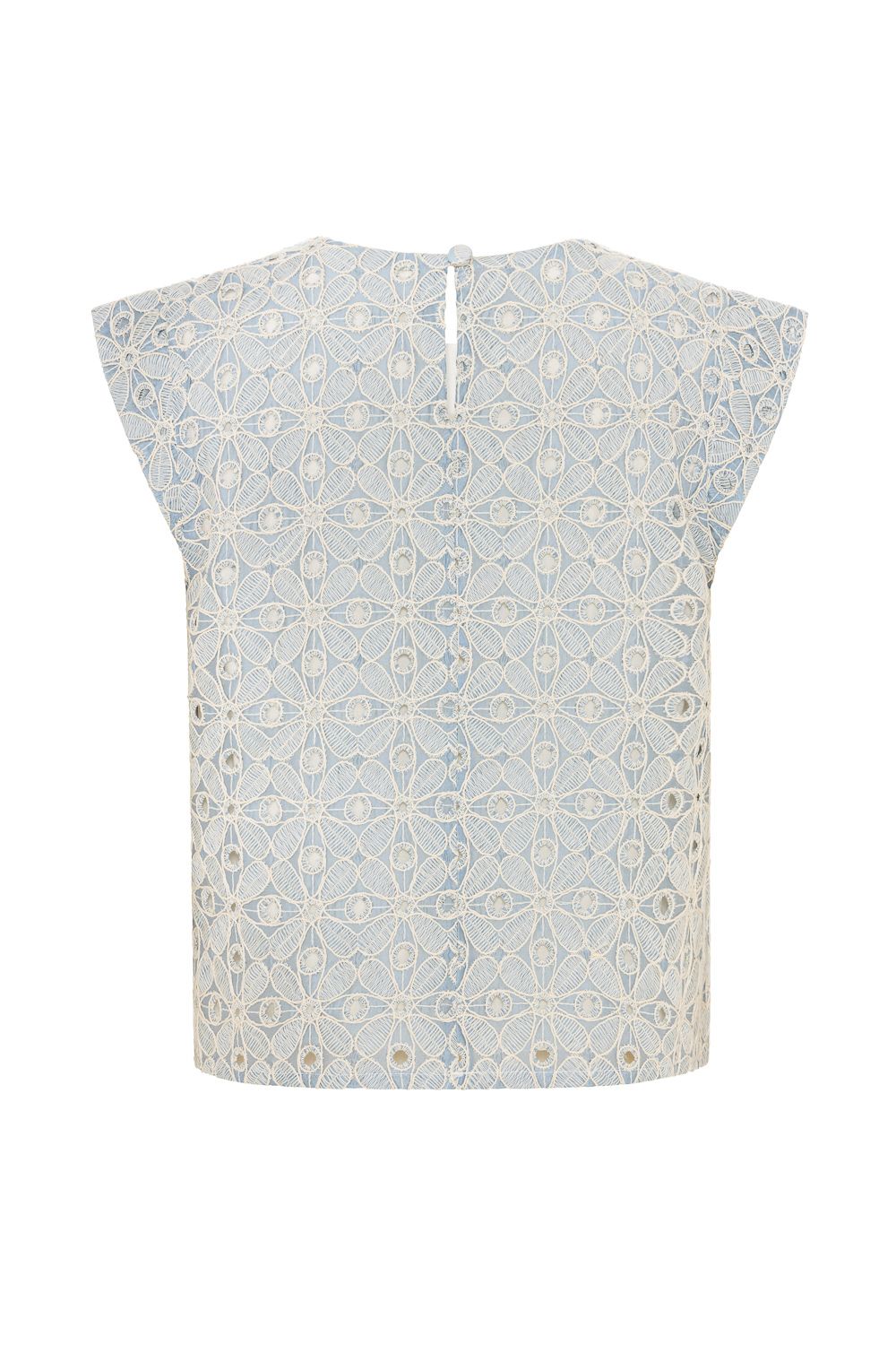 Blusa em laise na cor azul claro com bordado em relevo em off white. Gola em U, mangas curtas delicadas . Modelagem mais ampla porem ainda com estrutura e próxima ao corpo. Fechamento por leve abertura nas costas com botão forrado. Acabamento embutido duplo toda forrada em viscose off white.