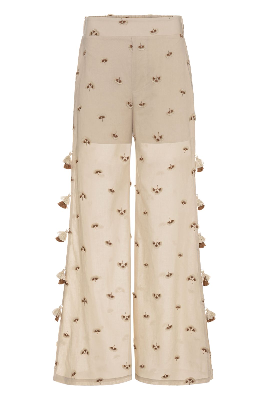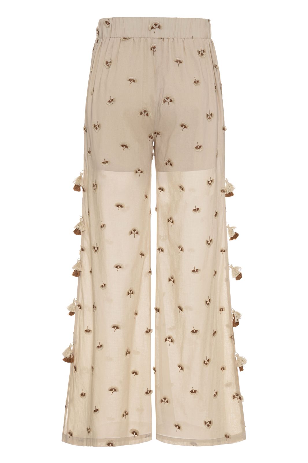 Calça em cambraia de algodão bordada na cor aveia, modelagem reta com caimento fluido, aberturas e bolsos laterais, cós com elástico nas costas, forro com viscose em comprimento curto promovendo maior conforto.