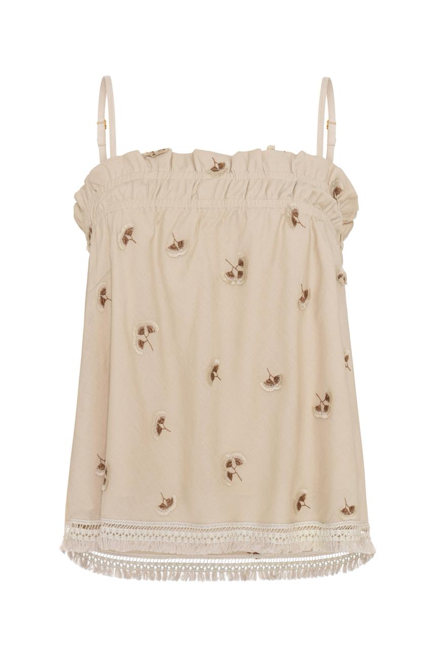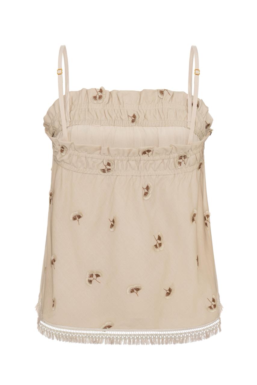 Regata em cambraia de algodão bordada na cor Aveia, modelagem ampla com caimento fluido, busto com elástico trazendo maior conforto, alças reguláveis e forro com viscose em comprimento curto
