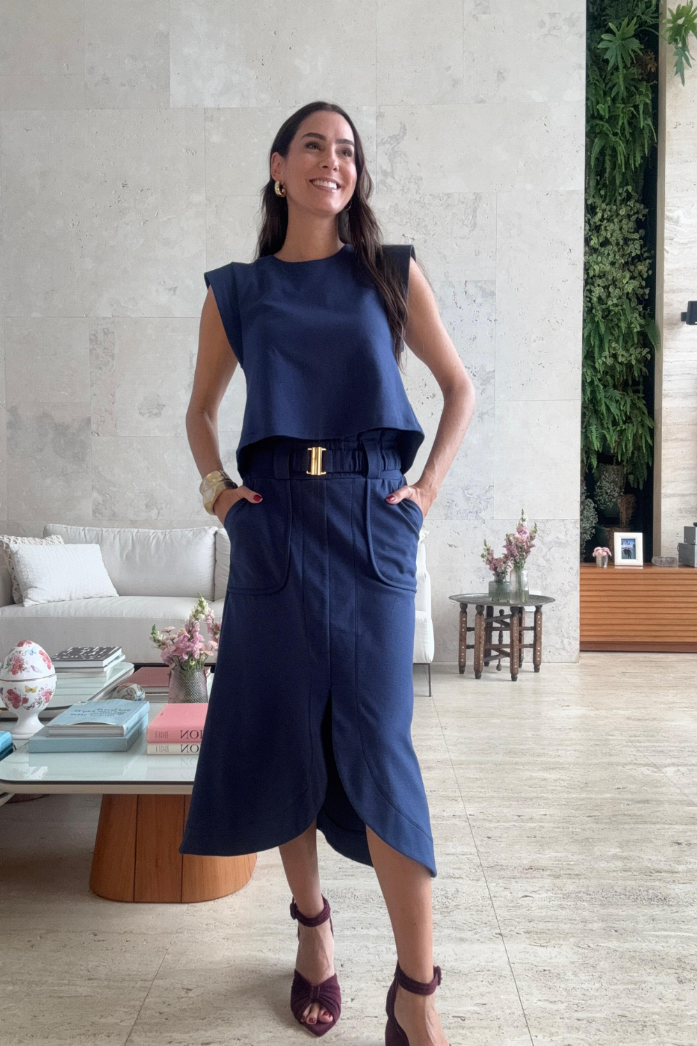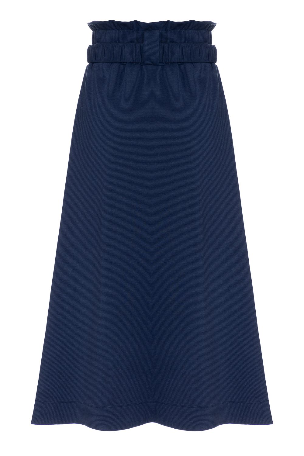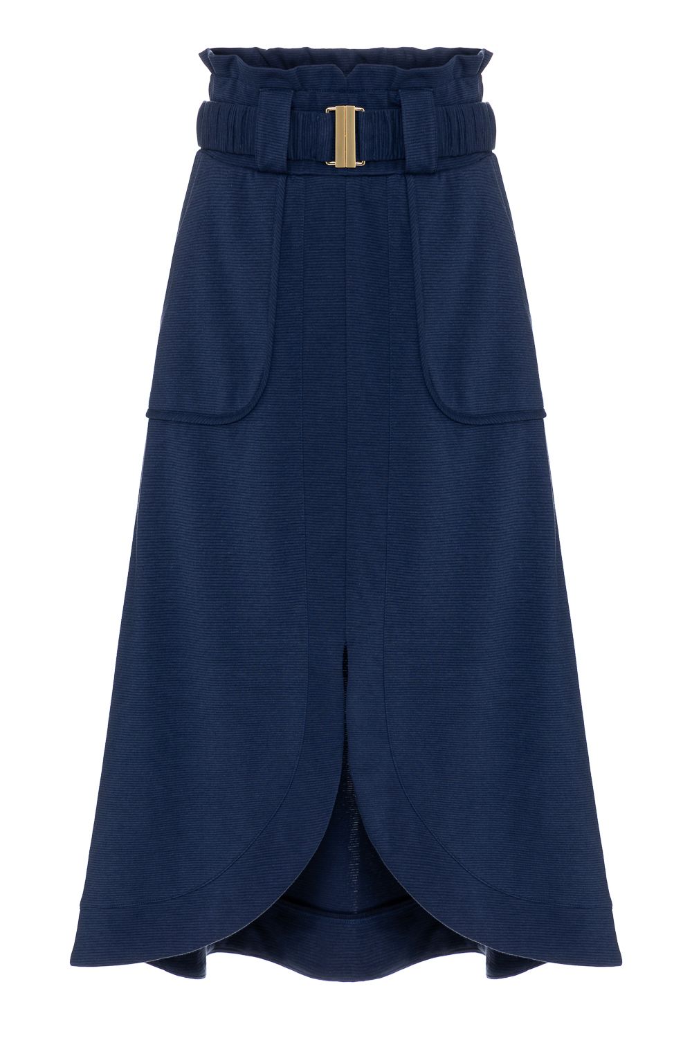 Saia mid na cor azul marinho. Modelagem ampla mas ainda com estrutura no caimento, com bolsos laterais e uma abertura na frente garantindo conforto e elegância . Cintura alta e uma pala com elástico. Detalhe com um cinto no mesmo tecido com fecho em metal dourado