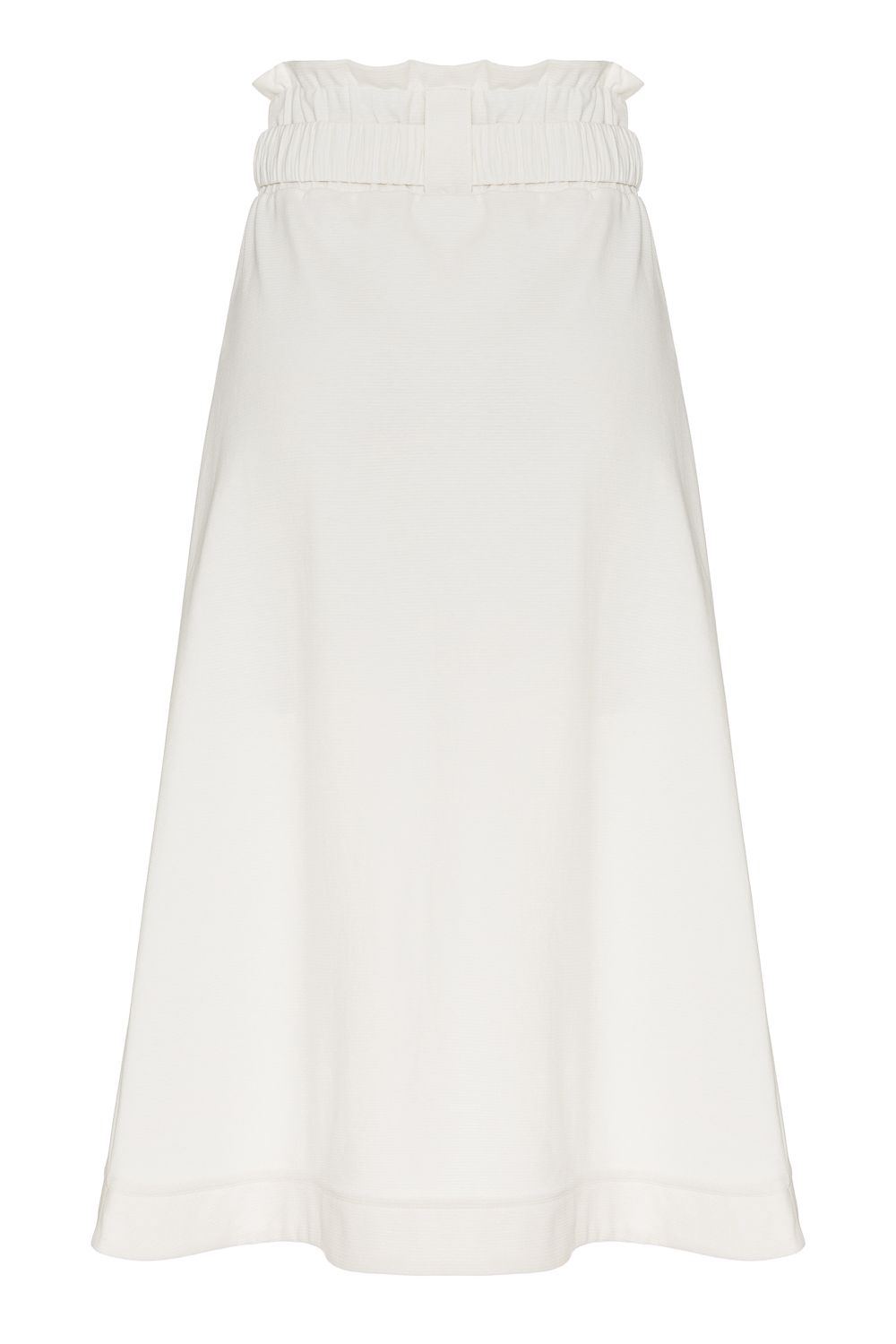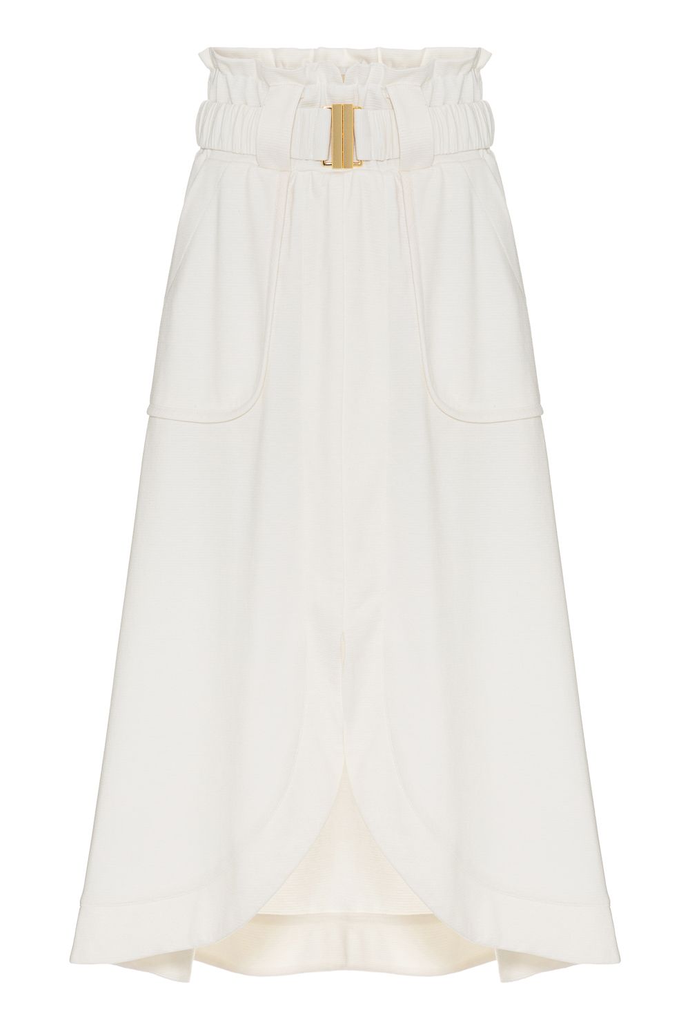 Saia mid na cor off white. Modelagem ampla mas ainda com estrutura no caimento, com bolsos laterais e uma abertura na frente garantindo conforto e elegância . Cintura alta e uma pala com elástico. Detalhe com um cinto no mesmo tecido com fecho em metal dourado