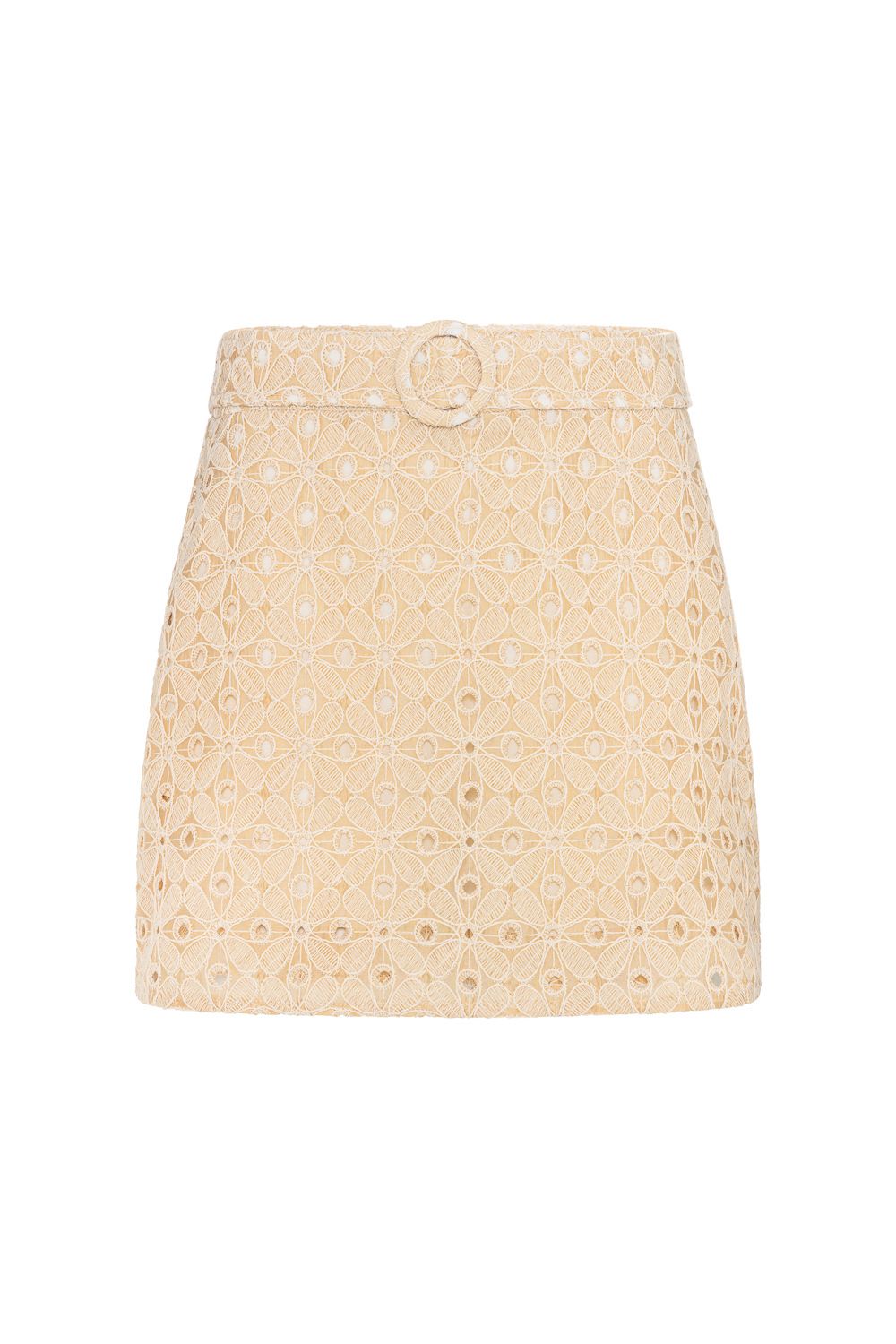Saia em laise bordada na cor marfim com off white. Acompanha shorts por baixo todo forrado em viscose para garantir maior conforto. Modelagem mais ajustada ao corpo no caimento, bolso faca nas laterais. Cintura alta com um cinto e fivela forrados no mesmo tecido da peça. Dois bolsos traseiros em alfaiataria e zíper invisível para fechamento na lateral.