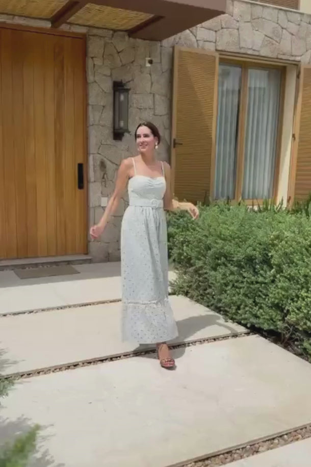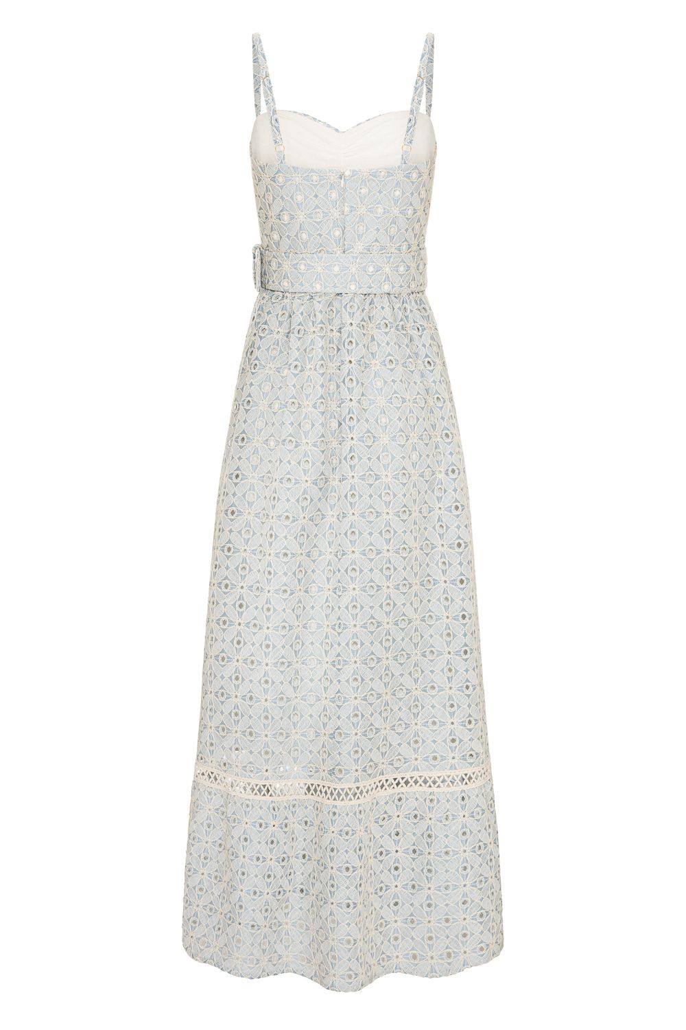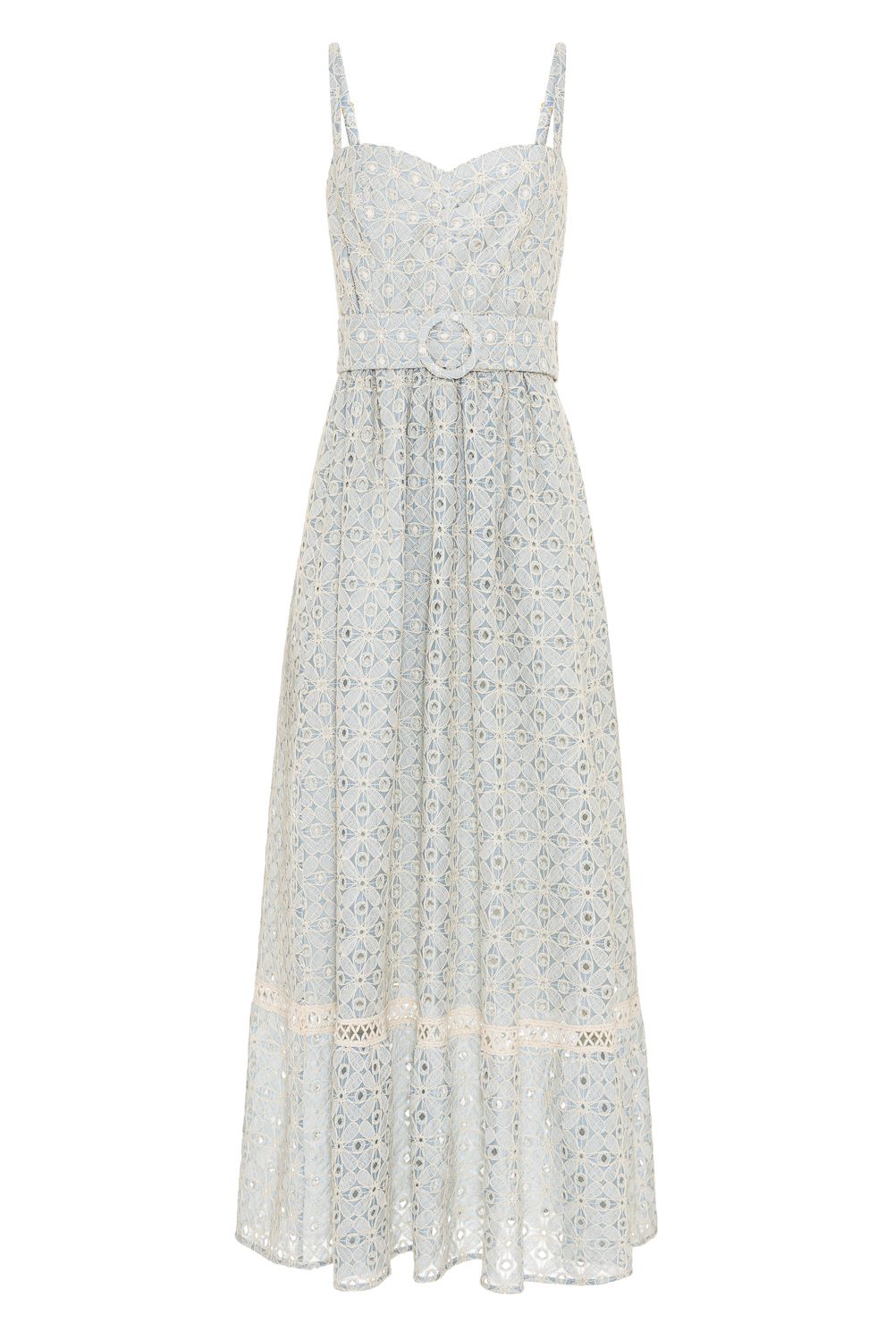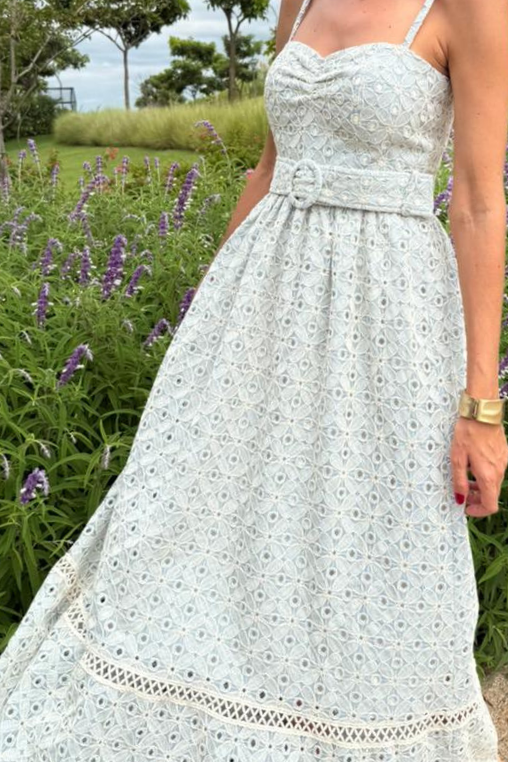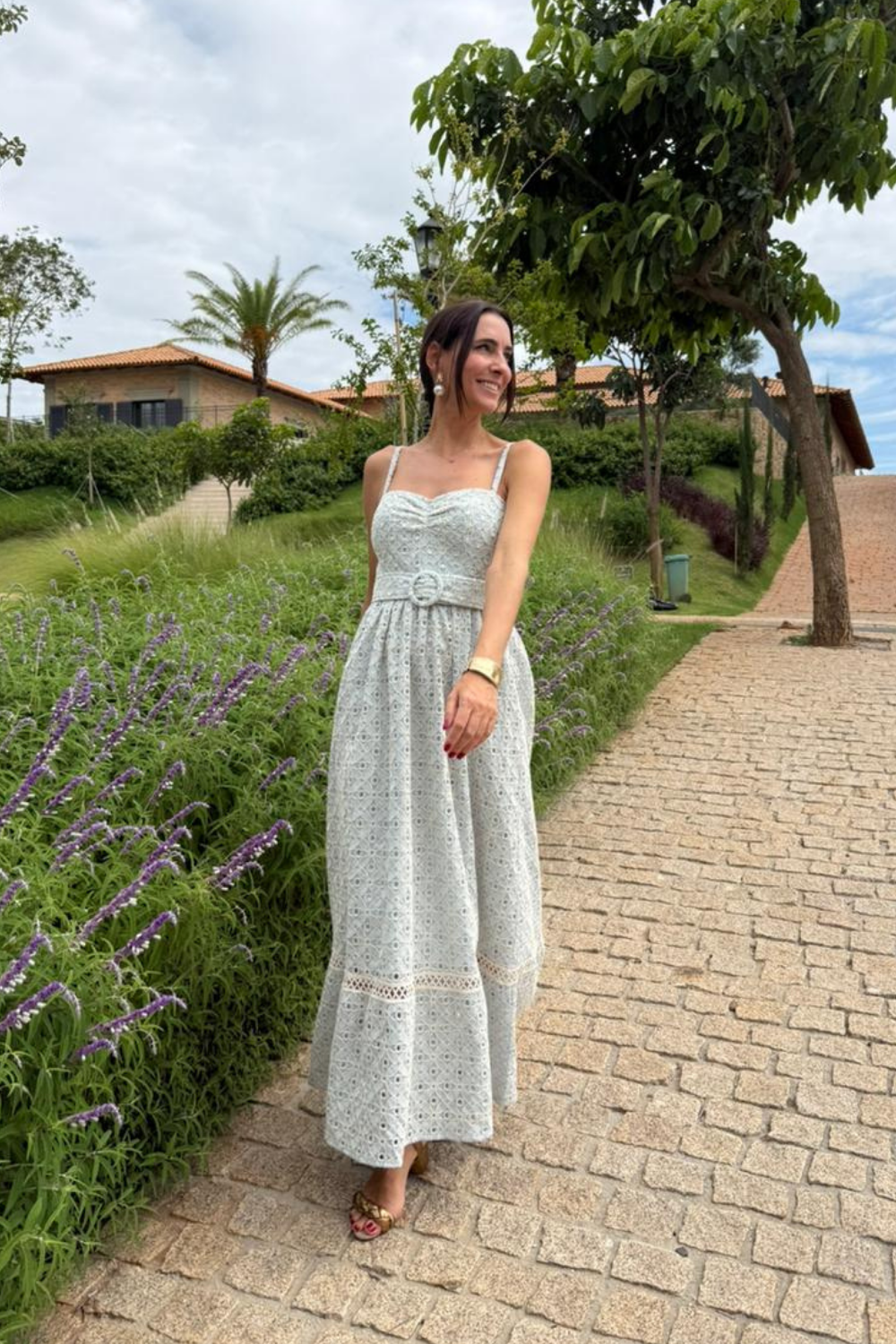 Vestido em laise bordada na cor azul e relevo em off white com desenhos florais, todo forrado em viscose off white. Decote em coração com leve franzido no centro, alças finas com reguladores nas costas. Modelagem acinturada e saia longa ampla com aplicação de renda em algodão no recorte do barrado. Fechamento por zíper invisível nas costas. Acompanha cinto forrado do próprio tecido para ajuste na cintura.