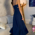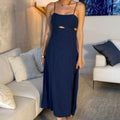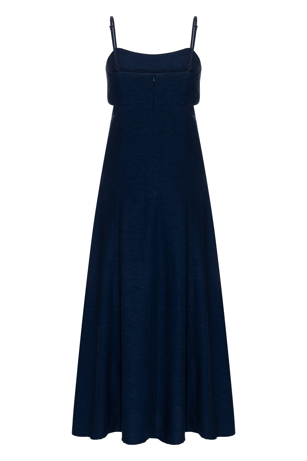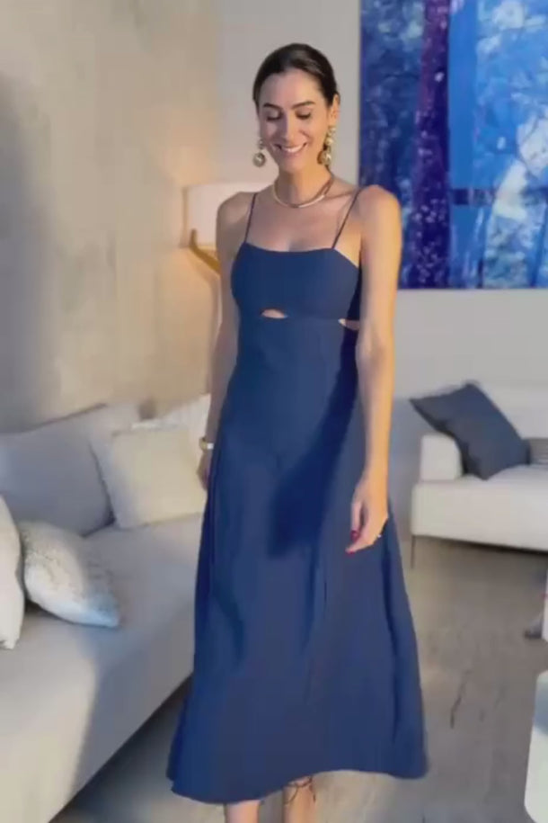 Vestido em viscolinho na cor marinho. Modelagem mais ajustada no busto com alças finas e regulador. Fechamento com zíper invisível nas costas. Comprimento midi/longo.